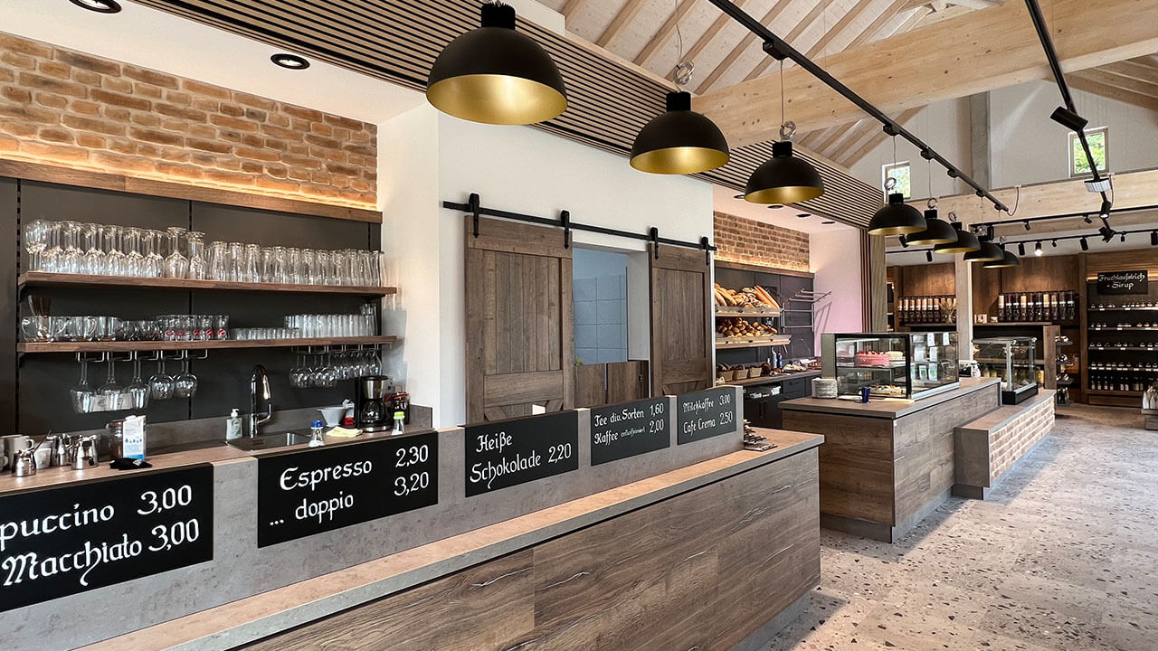 Wo sich ursprünglich über Jahre lediglich ein Verkaufshäuschen befand, entstand nun eine Verkaufs- und Genussscheune, die sich sehen lassen kann. Alles aus einer Hand – für Familie Bartels lieferten wir nicht nur die Planung für Beleuchtung, die Kühlmöbel, den gesamten Ladenbereich, die Thekenanlagen und die Bestuhlung des Gastro-Bereiches. Auch die Küche inklusive aller Geräte wurde von uns geplant und geliefert. Auch hier wissen wir, worauf es ankommt und was es für optimale Abläufe hinter den Kulissen zu beachten gilt. Das Hofcafé ist mittlerweile eine wichtige Säule für Familie Bartels und umfasst etwa 50 Sitzplätze im Inneren und in der Sommerzeit etwa 150 Sitzplätze im Außenbereich.