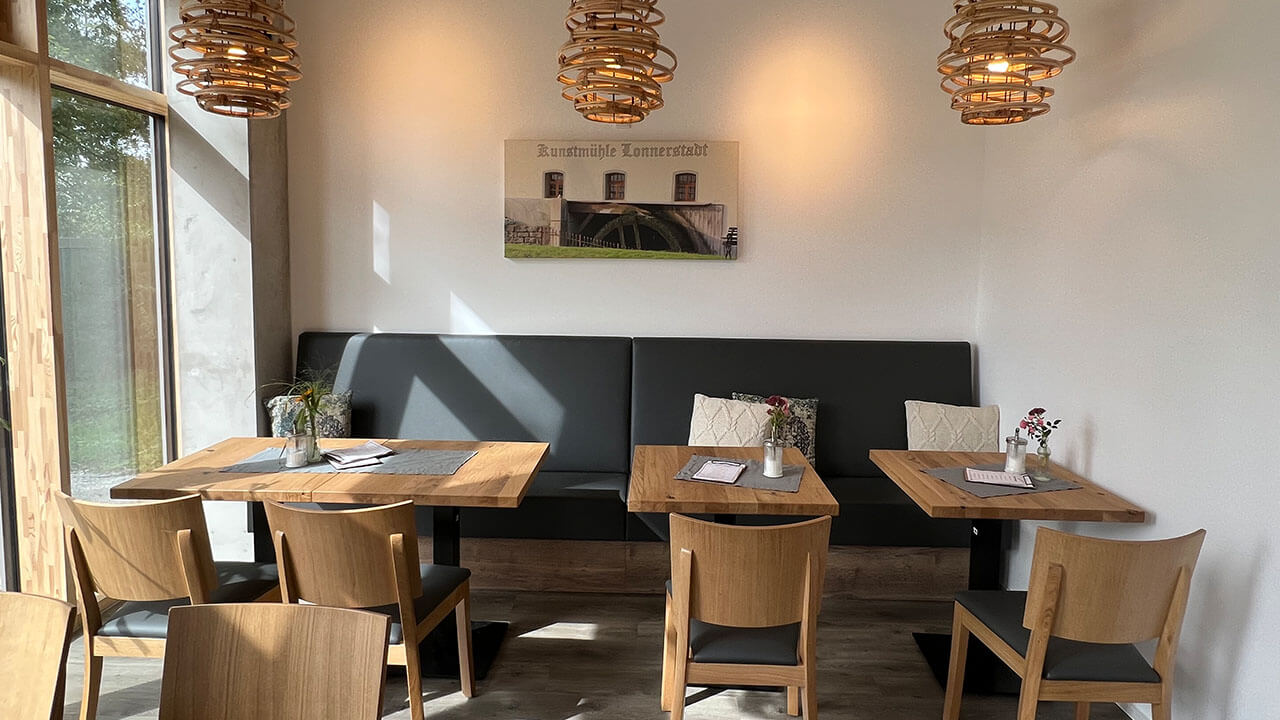 Egal ob in größerer Runde auf der langen Eckbank, am Stammtisch oder auch etwas ruhiger am Zweier-Tisch in einer der Sitznischen – das neue Hofcafé der Familie Heindl bietet den richtigen Rahmen. Das ruhige, stimmige Farbkonzept kombiniert mit viel Altholz und einem ausgeklügelten Beleuchtungskonzept inklusive der von Familie Heindl selbst gestalteten Hirschgeweihleuchte sorgen für Wohlfühlatmosphäre.