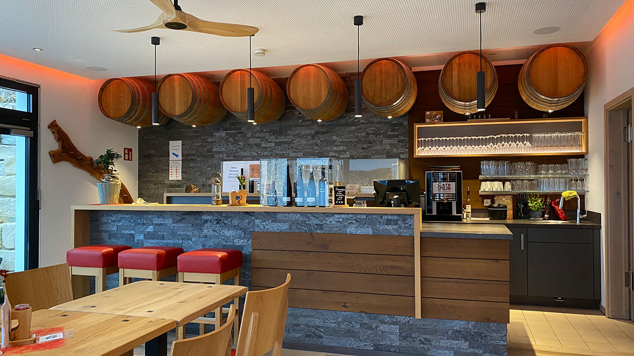 … das wäre großartig, dachte sich Harry Reichert. Als gebürtiger Pfälzer hatte es ihn vor einigen Jahren an den Rand der Schwäbischen Alb verschlagen – der Liebe wegen. Den Kontakt zu seiner Heimat wollte er jedoch nie verlieren. Aus diesem Grund erfüllte sich das Ehepaar nach langer Planungs- und Bauzeit den Wunsch nach eigener Pfalz-Gastronomie mit wunder¬vollem Blick über das grüne, schwäbische Tal. Diese Kombination harmoniert perfekt – genau wie die Gastroküche und die individuelle Einrichtung von sg Ladenbau.