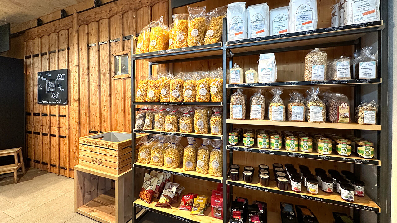 „Selbstgemacht“ ist das Motto des neu entstandenen Hofladens auf dem Breghof. So finden sich allerhand eigene Produkte von Aufstrichen und Nudeln über Convenience und eigene Molkereiprodukte sowie Backwaren in den Regalen.