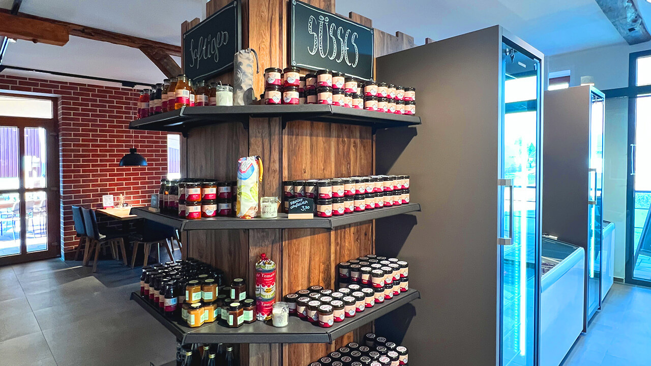Die guten Nerven haben sich gelohnt! Entstanden ist ein moderner Hofladen mit Cafébereich und Gastroküche. Die sehr individuellen Akzente sowie ansprechenden Ladenbau-Details fallen dabei ins Auge. Die eigenen Produkte wie Obst und Gemüse stehen im Fokus der Vermarktung, das erlesene Begleitsortiment lädt zudem zum Stöbern und Verweilen ein.