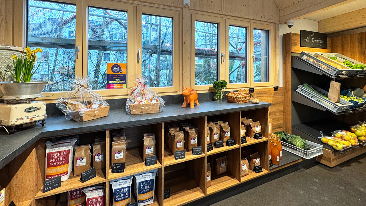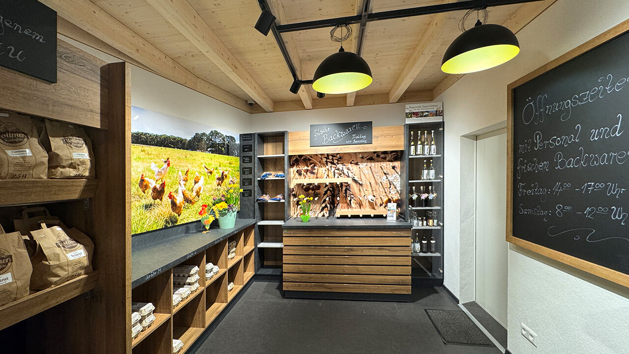 Bereits die Großeltern hatten Ihren ersten Laden mit uns eingerichtet - darauf folgten die Eltern. Nach der Hofübernahme durch den Sohn war klar, dass nur sg-Ladenbau als Einrichter des neuen Hofladens in Frage kommt. So entstand ein ganzheitliches Ladenbau-Konzept inklusive Beleuchtungsplanung, welches nach wie vor tagtäglich begeistert! Mit offenen Verkaufsregalen mit integrierter Beleuchtung werden die Waren einladend präsentiert und kommen vor den rustikalen Fachwerkwänden perfekt zur Geltung.