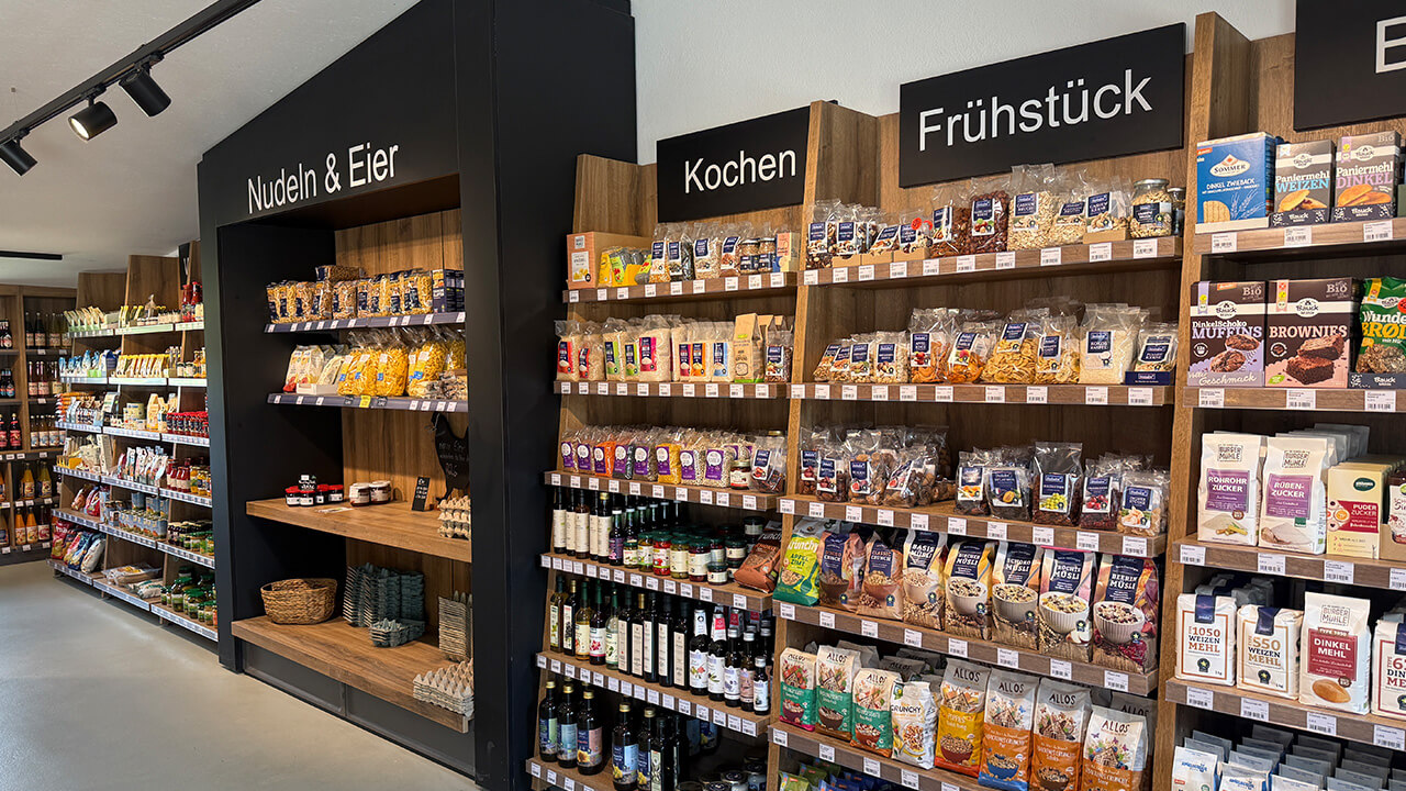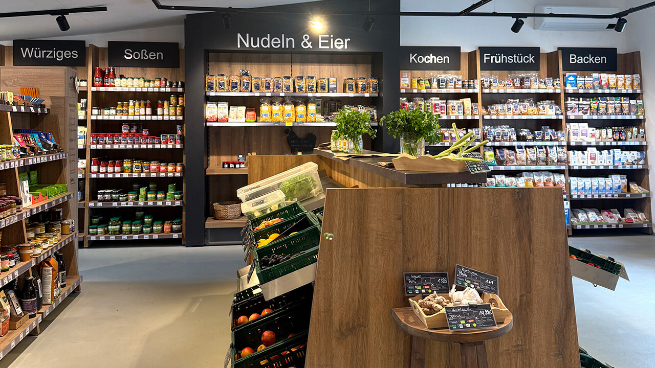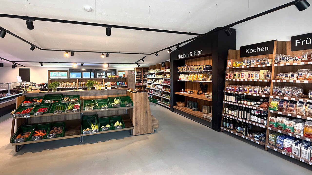 Früh war die Frage der Zusammenarbeit geklärt – es passte einfach gut. So entstand nach einem Gebäudewechsel der neue Bio-Hofladen inklusive Vorbereitungsküche und Beleuchtung. Mit Gemüseregalen, einer Verkaufstheke mit Kühlmöbel und Rückbereich mit Brotregal ist der Hofladen bei den Kunden äußerst etabliert und die Sortimentsvielfalt wächst stetig. Das bodenständige Konzept mit klaren Linien und der guten Übersicht überzeugt – eben eine wahre Erfolgsgeschichte!