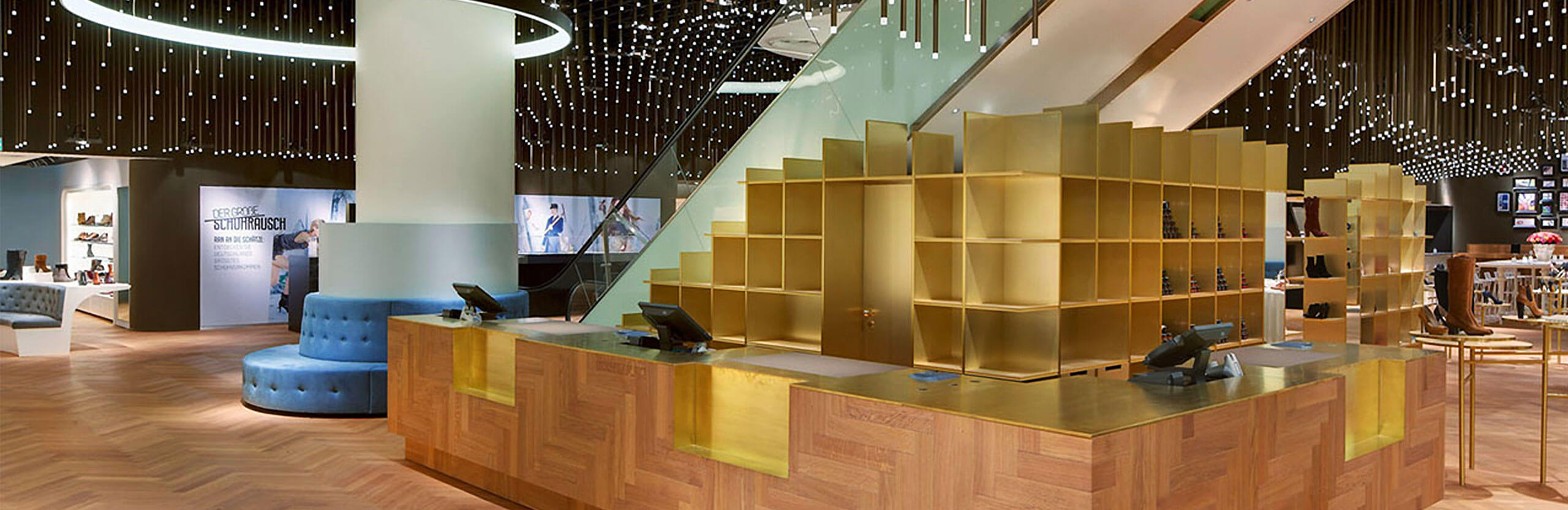 Unter der Rolltreppe platziert, downstairs wird die große Thekenanlage einmal durch die abgestufte Formensprache in Anlehnung an die Position, und zum anderen durch die ausgewählten Materialien und die beleuchteten Elemente zu einem nicht übersehbaren Highlight der umliegenden Design Modewelt. Hier ist ein Schuhhaus im Modehaus entstanden, das seinesgleichen sucht!