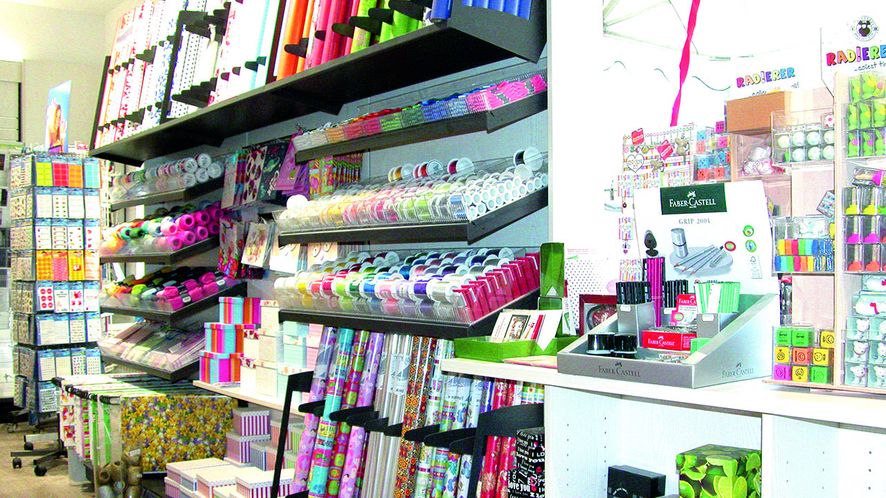 Ein Eingang über Eck und die Verteilung in zwei gleichwertig große Verkaufsflächen rechts und links davon. SGL löst diese Herausforderung über zwei runde gegenüberliegende Theken als raumverbindende Elemente. Der Schreibgeräteverkauf erfolgt in einer Beratungsnische mit Kindertreppe ...